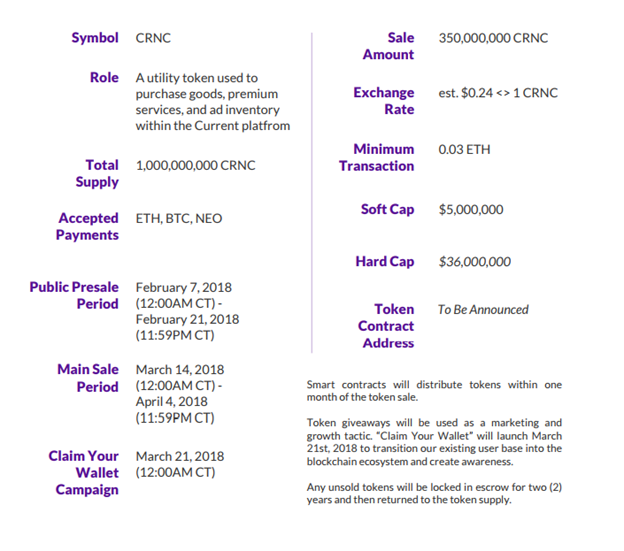 A Token The Current utility token, CRNC (pronounced “currency”), reduces or eliminate premium subscription costs and facilitates ad purchases.