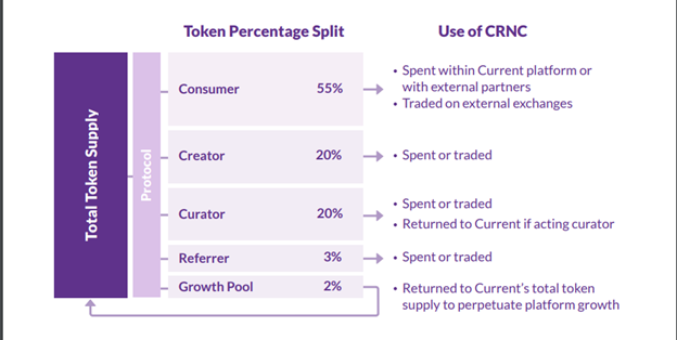 Current’s blockchain attribution protocol accurately and transparently compensates contributions to the recommendation algorithm and overall growth of the Current ecosystem. A token is “mined” when a user plays media within the platform. Each token that is mined is split amongst the creator, curator, consumer and potential referrer.