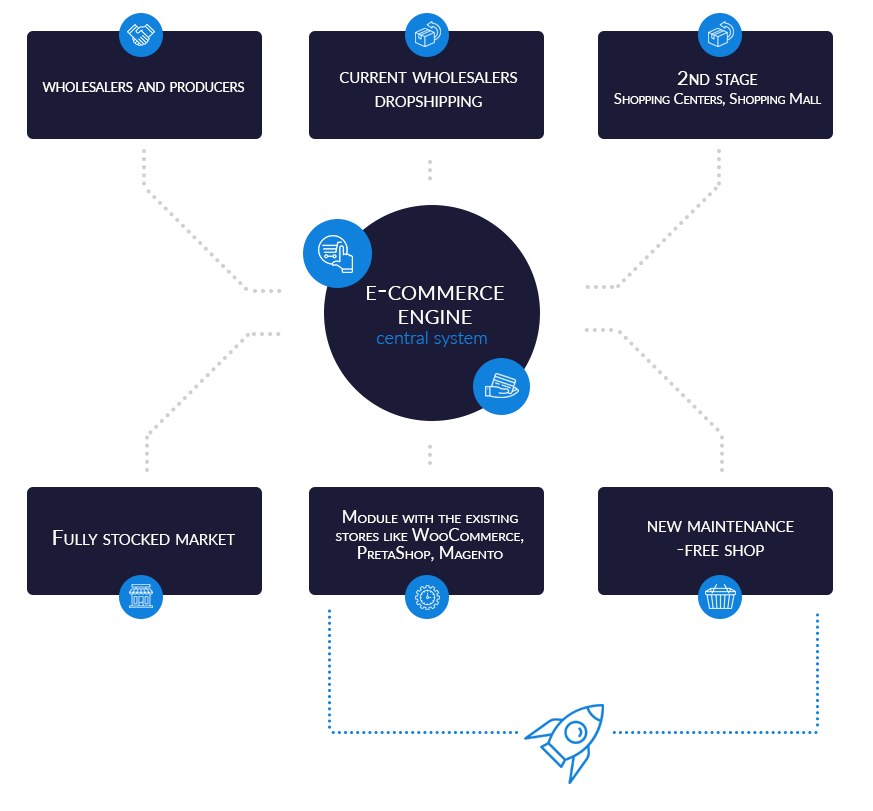 革新的なソリューションの導入により、個々のプロデューサーと卸売業者は世界中の個々の起業家が運営する数十万の散在したオンラインストアの影響を利用することができます。既存および新規事業のソリューション。